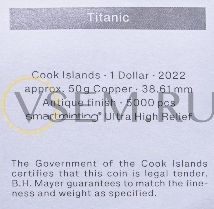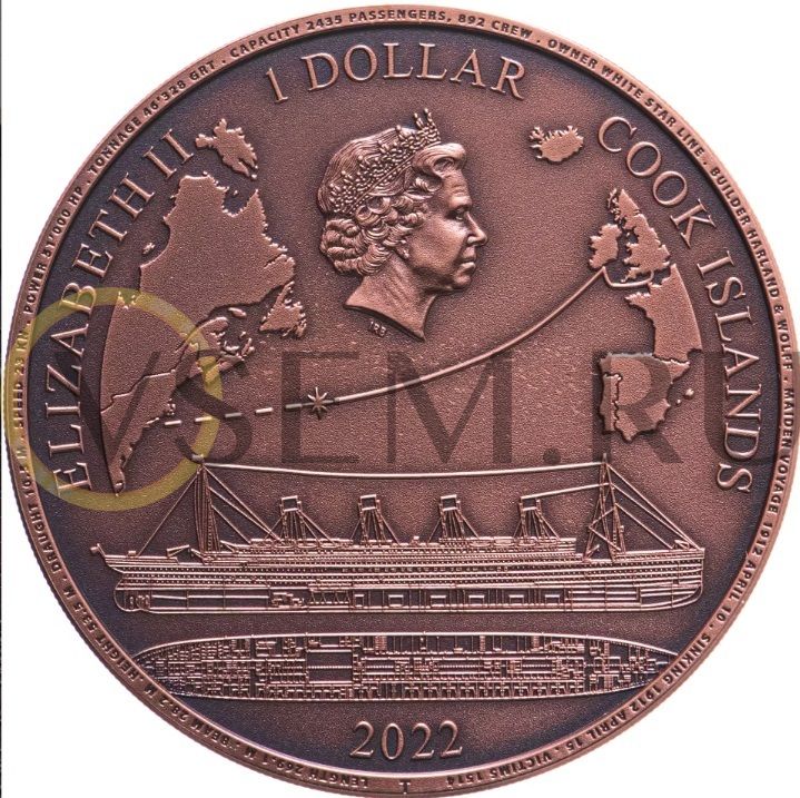 Острова Кука 1 доллар 2022 Корабль Титаник, в капсуле с сертификатом